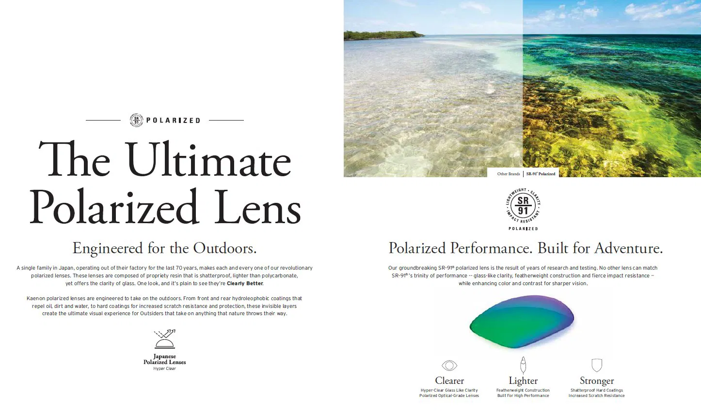 עם טכנולוגיה שפותחה במיוחד לשימושים (outdoor) חיצוניים, Kaenon מציעה עדשות פולרייזד יפניות באיכות עילאית – כאלו שמספקות עומק, ניגודיות, צלילות ותחושת רוגע לעין.